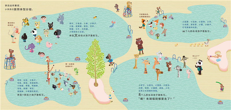 此外,与以往赖马其他绘本一样,《朱瑞福的游泳课》中也隐藏着超多知识点和超多细节,等着小读者来发现。你知道青蛙、腊肠狗、长吻鳄都是怎么游泳的吗?生气王子、爱哭公主、小珍珠,还有赖马一家人都藏在人群里学游泳呢,你发现了吗?快来找找看吧!