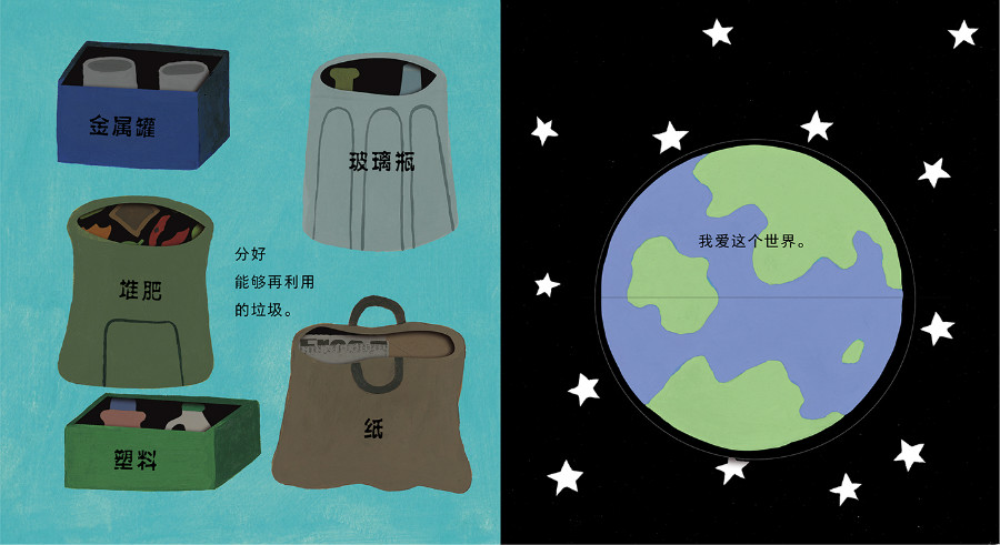 书中展示的事情都是关于环保的,比如离开房间时关灯、步行上学、把垃圾都扔进垃圾桶并做好垃圾分类……鼓励孩子们从身边的小事做起,减少不必要的浪费,保护环境。