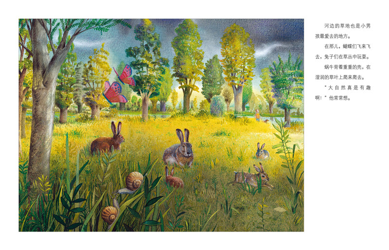 一个赤脚的小男孩和他的小猎犬在河岸边玩耍。树枝上的鸟儿、沙地上的小虫、草丛中的野兔、飞舞的蝴蝶、小小的蜗牛、天空中飘落的雨滴、捕食的青蛙和蜘蛛、清澈河水中的古老化石、捕鱼的天鹅……自然界发生的一切都令他着迷和惊喜。