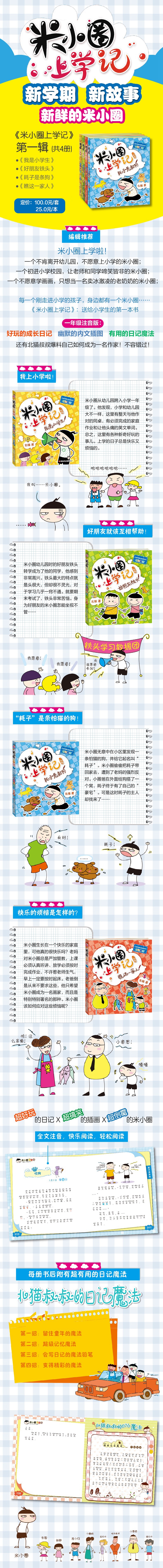 《米小圈上学记》丛书内容简介: 米小圈长大了,要去上小学了,他不会永远待在幼儿园,虽然这是他的梦想。小学和幼儿园大不一样,这里有整天与他作对的同桌,有必须完成的家庭作业。总之,这里有各种新奇好玩的事儿。上学的日子总是快乐又烦恼的。米小圈把这些通通写在了自己的日记里。翻开这本日记你会发现,米小圈是他,或许也是你。