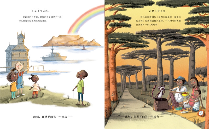 本书描述了在同一个时刻,生活在世界上24个时区里的人们正在同时经历着不同的事情。故事是从圣弗朗西斯科的早晨6点开始的,带领读者来到24个极具代表性的国家和地区,每个地方所处的时区不同,环游世界之后,又回到了故事开头的地方,这里还是早晨6点钟。这是一本跨越24时区的多元文化游记,小读者随着画面的转移,在书中“游览”世界各地,进行一场“全球旅行”,了解到每时每刻,在我们这颗星球上都在发生着丰富多彩而奇妙的事情,孩子们通过本书不仅了解了世界地理、理解了时区的概念,还可以学习到世界各地特色的人文知识,在本书的后,还有对地球的整体介绍,以及自制观察时间小工具的方法。