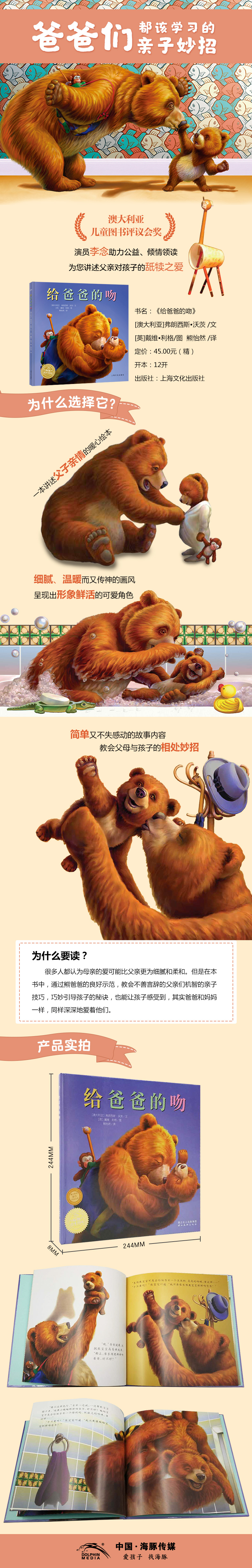 熊爸爸并不生气,他不紧不慢地,一边给熊宝宝洗澡,再穿上睡衣,一边不停地逗熊宝宝,要求熊宝宝给他一个吻,还不断地启发熊宝宝:像长颈鹿那样吻爸爸,给爸爸一个长长的、高高的吻哦;像小考拉那样吻爸爸,给爸爸一个痒痒的、粘粘的吻哦;像小鳄鱼那样吻爸爸,给爸爸一个爽爽的、潮潮的吻哦;像小蝙蝠、小老虎、小猴子……