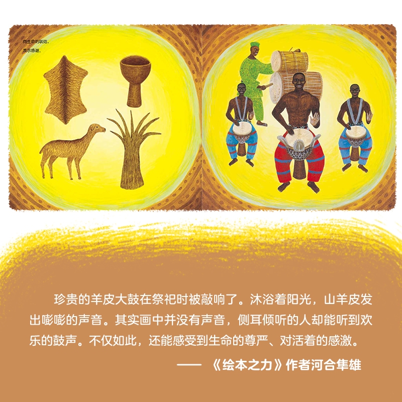 珍贵的羊皮大鼓在祭祀时被敲响了。沐浴着阳光,山羊皮发出嘭嘭的声音。其实画中并没有声音,侧耳倾听的人却能听到欢乐的鼓声。不仅如此,还能感受到生命的尊严、对活着的感谢。