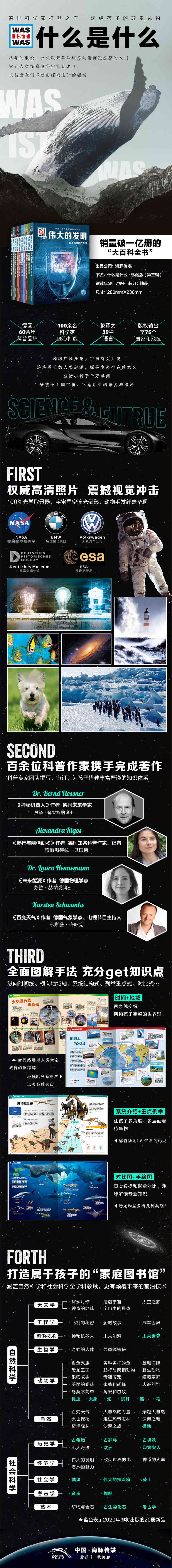 (1) 源自德国,经典60年。《什么是什么》系列是德国知名的少儿科普品牌,该系列百科全书出版60年以来长盛不衰,在德国本土的销量累计超过6000万册。在世界范围内,该套百科全书已被翻译为39种语言,遍及45个国家和地区,销量超过8000万册,是受世界各地青少年喜爱的科普图书之一。